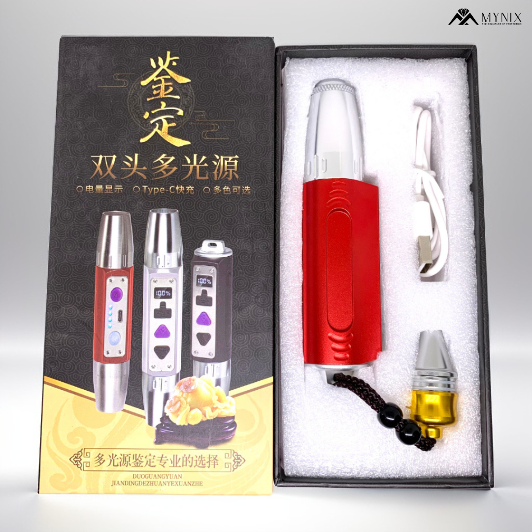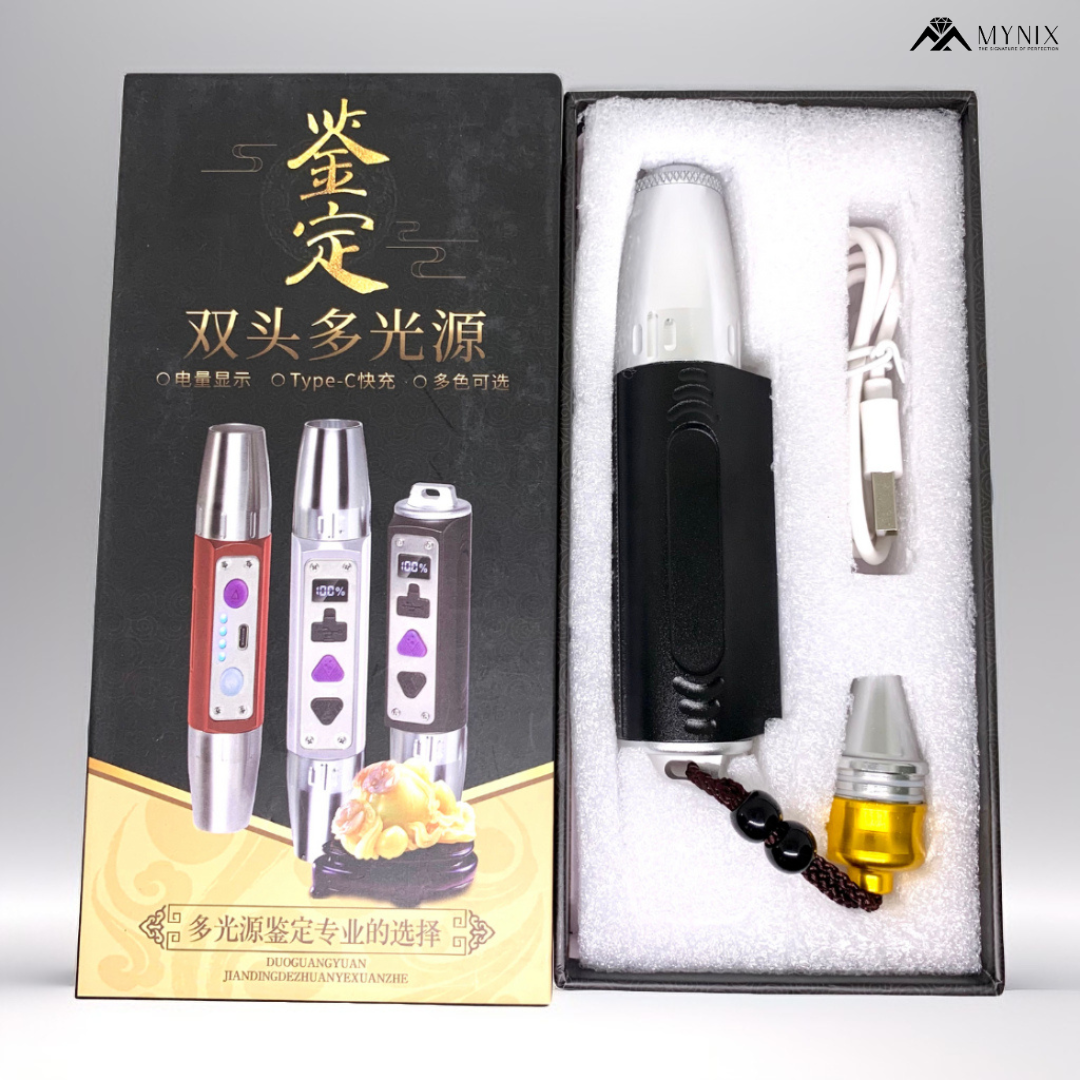Compact and powerful 3 LEDs rechargeable gem torch with white, yellow, and 365nm/395nm UV lights – perfect for gemstone identification and inspection. Includes battery level display and 6-month warranty. Ideal for jewelers and gem enthusiasts.