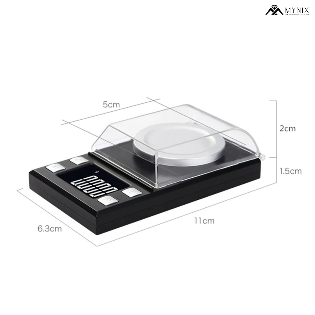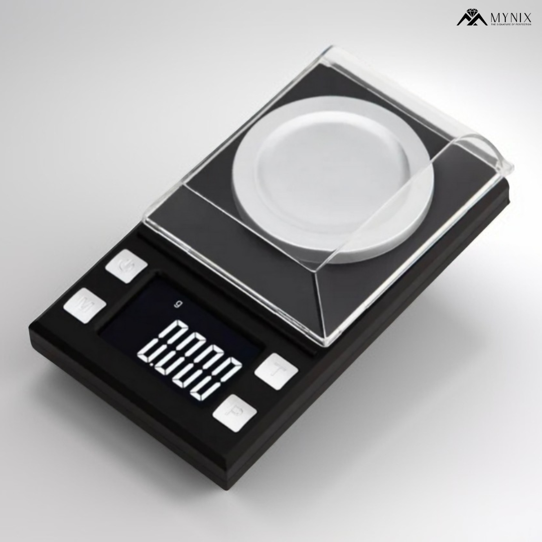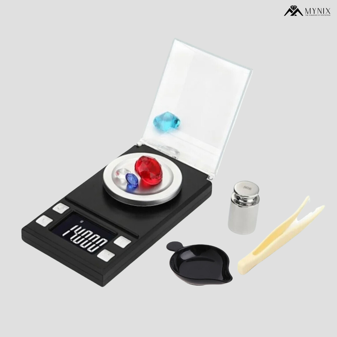 Professional digital scale with laboratory-grade 0.001g accuracy for weighing gold, silver, diamonds, and precious gemstones. Features 50g capacity, 7 units (g/ct/oz/dwt), tare function, and clear LCD display. Essential tool for jewelers, gemologists, and precious metal dealers.