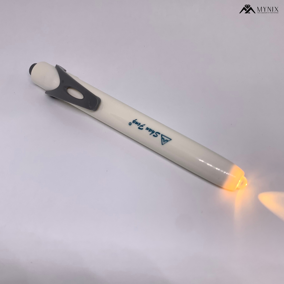 Alexandrite Color Change Checking Pen Torch with a yellow filament bulb designed to simulate warm light for accurate gemstone color-change testing. Compact pen-style design, powered by 2 AAA batteries—ideal for gem traders, jewelers, and gemstone collectors. Perfect for checking alexandrite and other color-change gemstones quickly and easily.